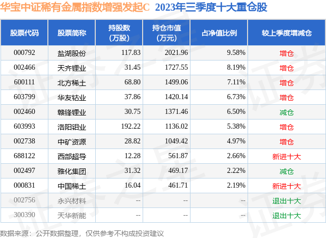 證券之星消息,日前華寶中證稀有金屬指數(shù)增強(qiáng)發(fā)起C基金公布三季報(bào),2023年三季度最新規(guī)模1.73億元,季度凈值漲幅為-13.16%。