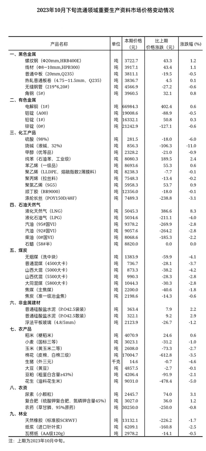 據(jù)對(duì)全國(guó)流通領(lǐng)域9大類(lèi)50種重要生產(chǎn)資料市場(chǎng)價(jià)格的監(jiān)測(cè)顯示,2023年10月下旬與10月中旬相比,15種產(chǎn)品價(jià)格上漲,34種下降,1種持平。