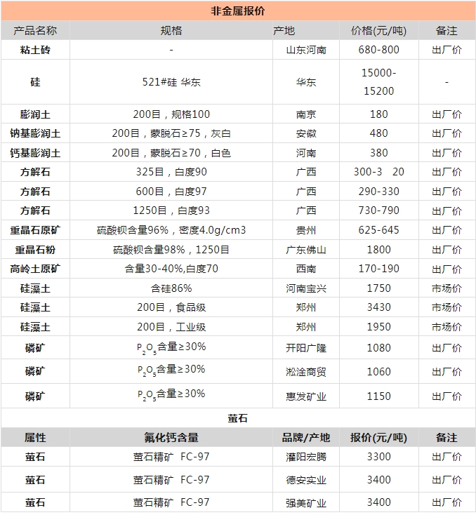 非金屬礦產(chǎn)品報(bào)價(jià)