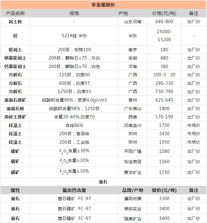 非金屬礦產(chǎn)品報(bào)價(jià)