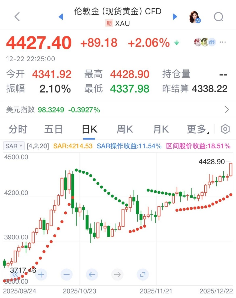12月22日,倫敦現(xiàn)貨金價強勢拉漲,于12:55左右首次突破4400美元/盎司歷史關(guān)口,再創(chuàng)歷史紀錄。截至發(fā)稿時,倫敦金盤中高點4428.9美元/盎司。周大福、老鳳祥等主流金店零售金價同步上調(diào),周大福報1368元/克,單日漲幅0.59%。