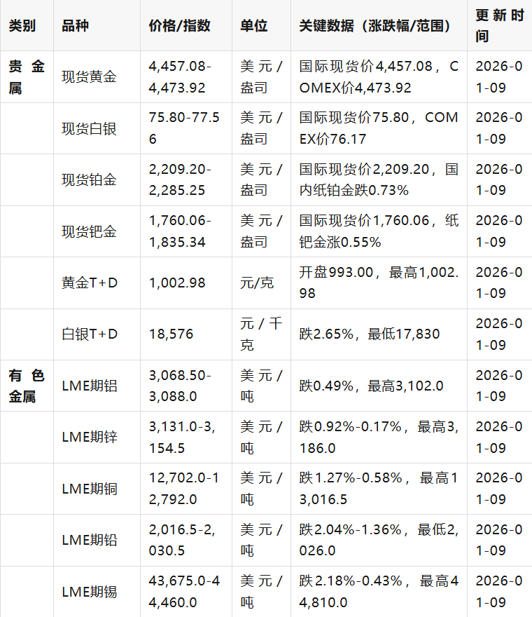 4. 更新時(shí)間統(tǒng)一為2026年1月9日,部分品種標(biāo)注具體交易時(shí)段(如COMEX黃金18:29:22最新價(jià))。