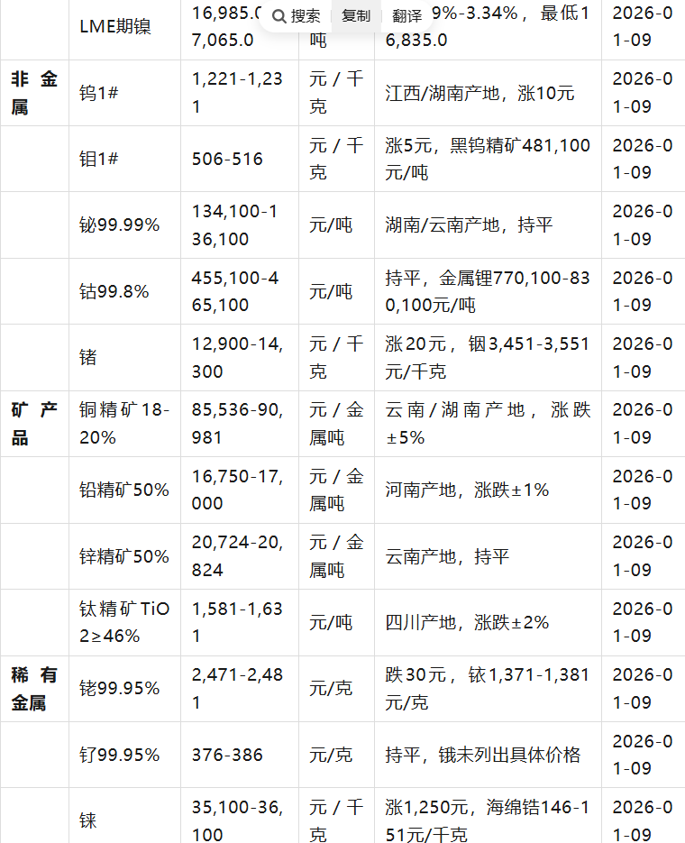 科礦|1月9日金屬、礦產(chǎn)品及非金屬現(xiàn)貨行情報(bào)價(jià)單