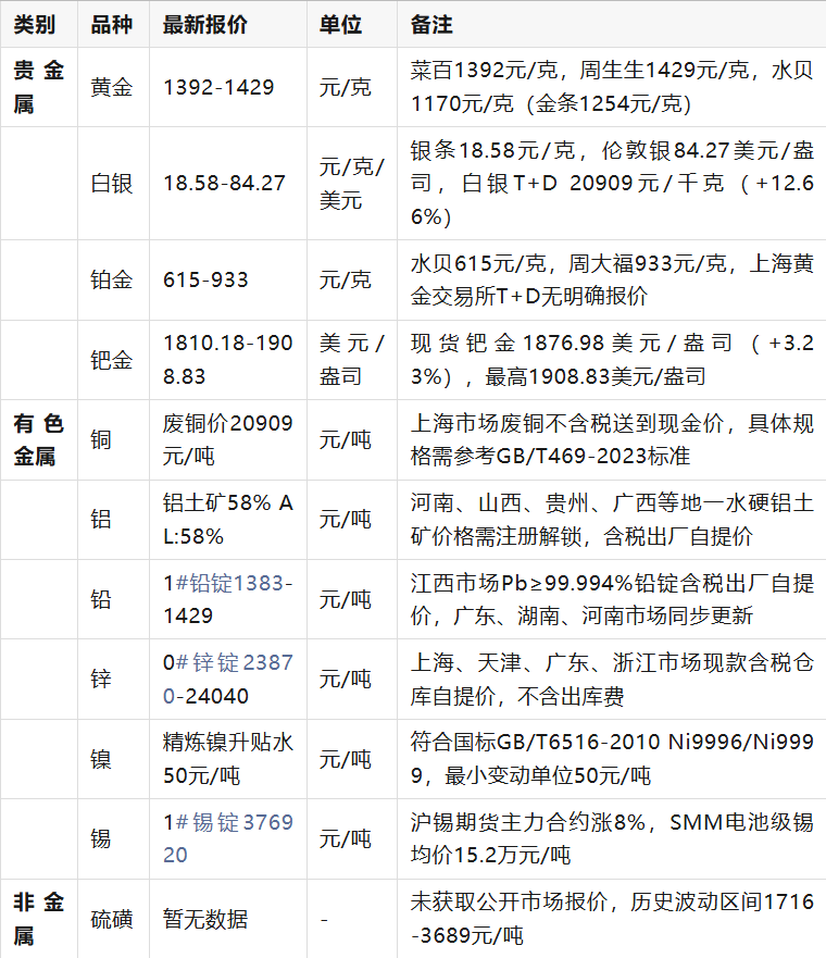 貴金屬價(jià)格受國際地緣政治、美元指數(shù)及通脹預(yù)期影響顯著,黃金、白銀本周累計(jì)漲幅分別達(dá)3.96%、11.72%,但波動率加劇。有色金屬中錫價(jià)受印尼減產(chǎn)消息刺激,兩周暴漲超20%,但交易所三次上調(diào)保證金抑制投機(jī)。非金屬硫磺、磷礦石價(jià)格受季節(jié)性需求及環(huán)保政策影響波動,磷礦石1月6日突漲至602元/噸后回落。稀有金屬鎢價(jià)因供需失衡呈現(xiàn)高波動,鉬價(jià)相對穩(wěn)定。銦、鉭因市場透明度低,缺乏公開報(bào)價(jià)。鐵礦石以美元計(jì)價(jià)為主,PB粉、卡拉加斯粉為代表品種,反映遠(yuǎn)期市場預(yù)期。數(shù)據(jù)時效性截至2026年1月12日18:00,實(shí)際交易請以實(shí)時行情為準(zhǔn)。