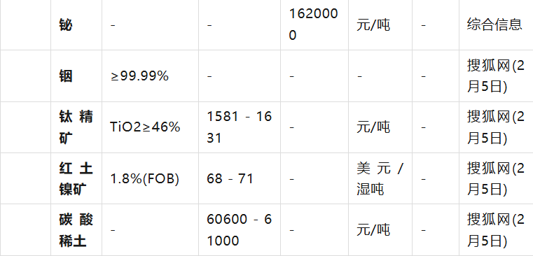 :以上表格中大部分價(jià)格為2026年2月13日的現(xiàn)貨報(bào)價(jià)。部分稀有金屬(如銦、鈦精礦)的價(jià)格數(shù)據(jù)更新于2月5日,請(qǐng)注意其時(shí)效性。